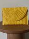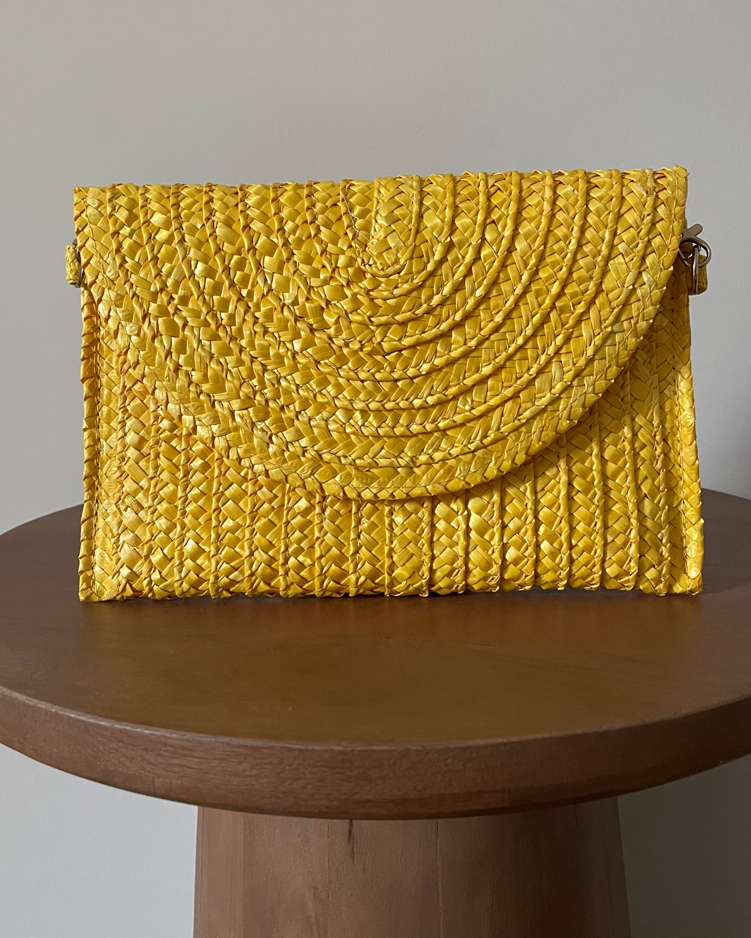 A stunning blend of elegance and casual charm. This straw clutch bag, adorned with a chic gold chain, is perfect for any occasion. Elevate your accessory game with this cute bag.