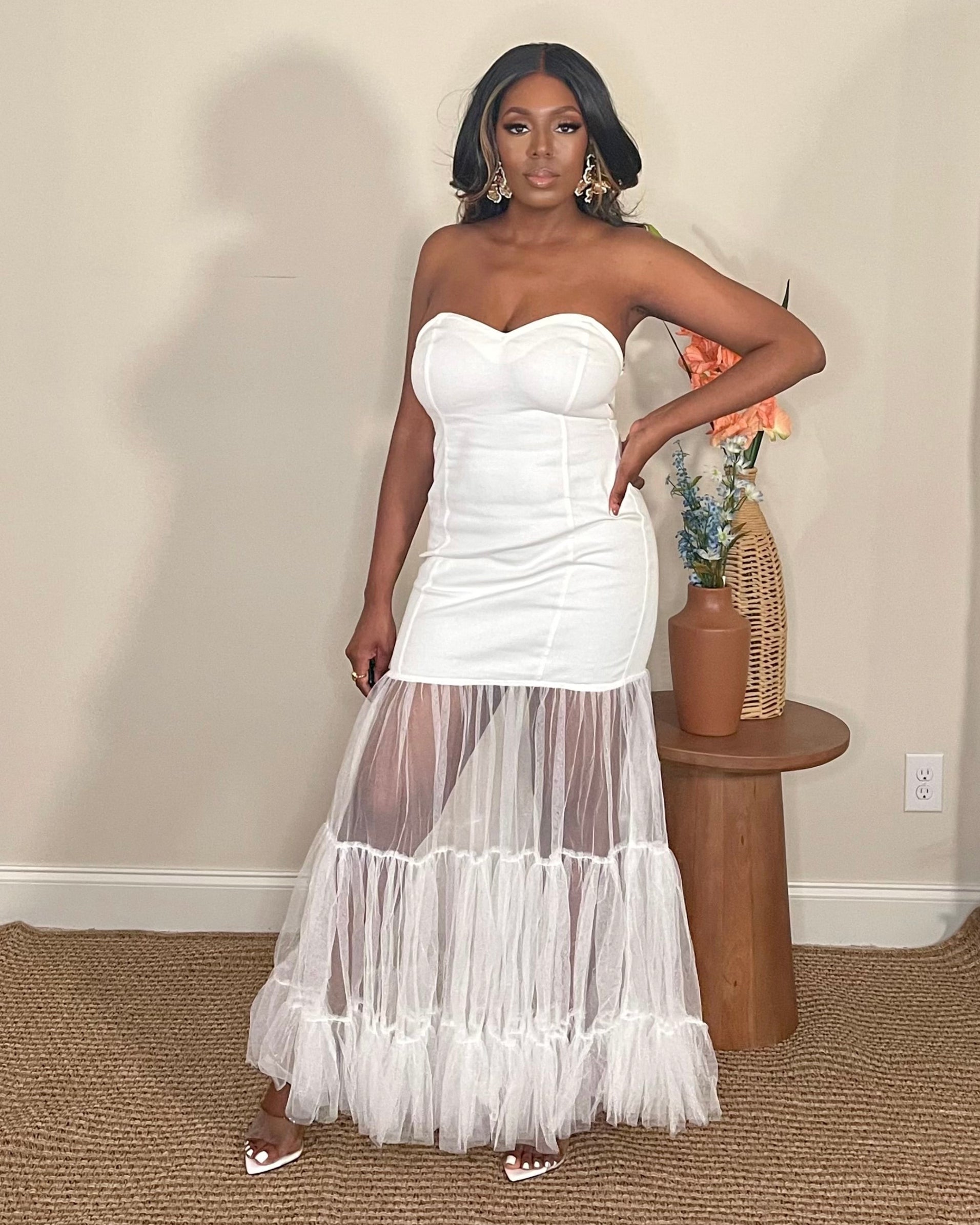 Dazzle at your all-white soirée in our Midsummer Glow Twill Maxi Dress! This head-turner features a body-contouring silhouette that hugs in all the right places, while the playful ruffled tulle bottom adds movement and drama. Classy yet flirty, this dress ensures you'll be the belle of any summer celebration. Perfect for making unforgettable memories under the stars!