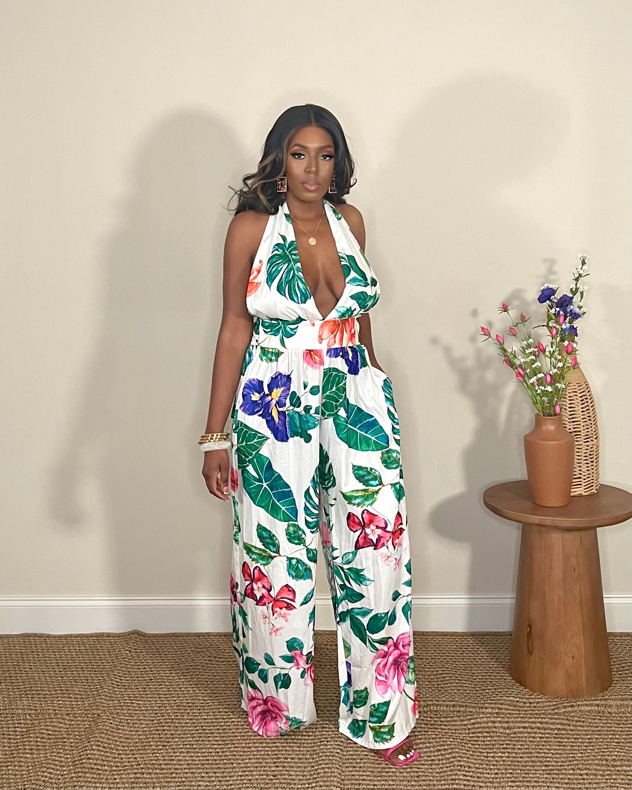 Dive into summer with our Garden Party Floral Jumpsuit! This eye-catching piece features a luxurious linen-feel fabric adorned with vibrant floral and leaf prints. The flirty plunging neckline and halter design create a stunning silhouette perfect for brunching with friends or stealing the spotlight on summer date nights. Turn heads and feel fabulous wherever you go!